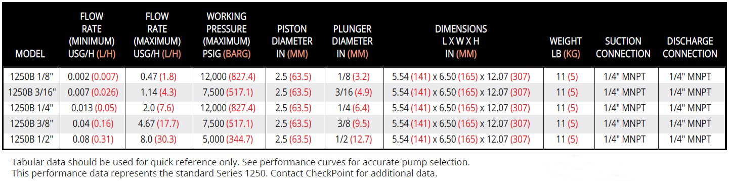 CheckPoint’s Series 1250 pump delivers up to 8 USG/H (30.38 L/H) and can reliably inject into pressures up to 12,000 PSIG (827.4 BARG).