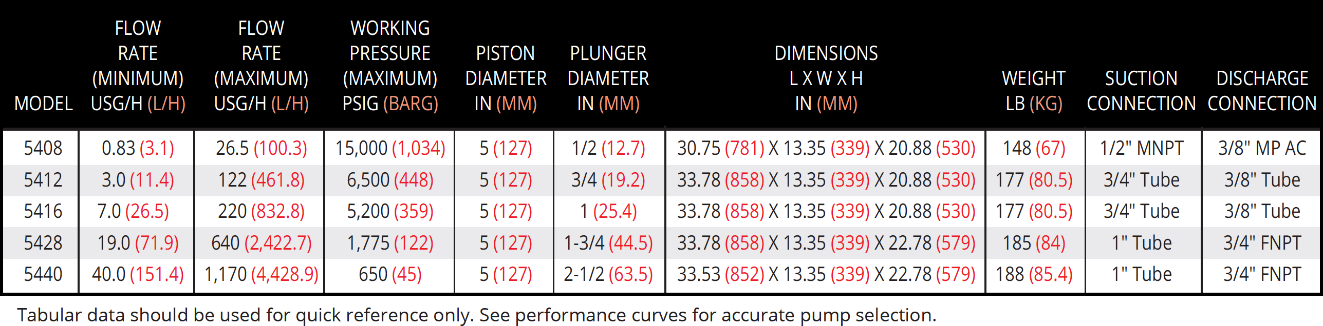CheckPoint’s Series 5400 pump delivers between 0.83 – 1,170 USG/H (3.14 – 4,429 L/H) and can reliably inject into pressures up to 15,000 PSIG (1,034 BARG).