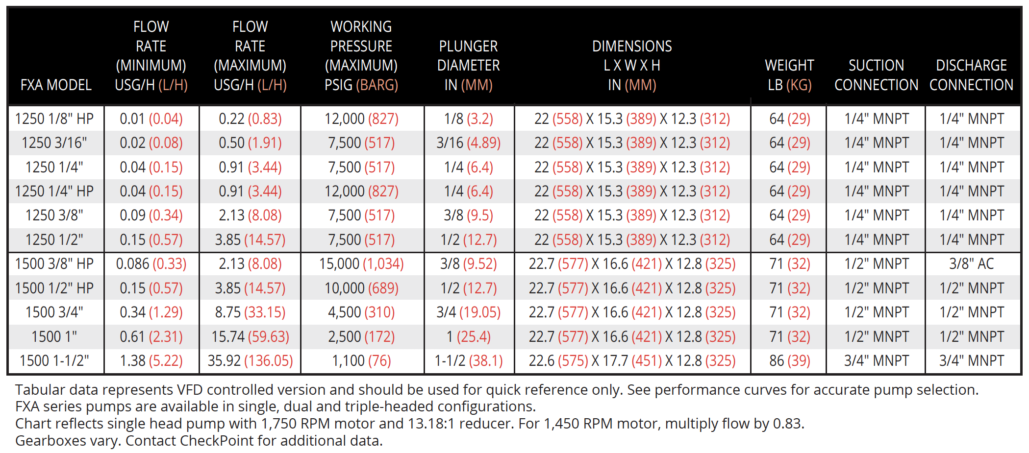 CheckPoint’s Series FXA electric/solar plunger pump delivers between 0.01 – 35.92 USG/H (0.037 – 136 L/H) and can reliably inject into pressures up to 15,000 PSIG (1034 BARG) per head.