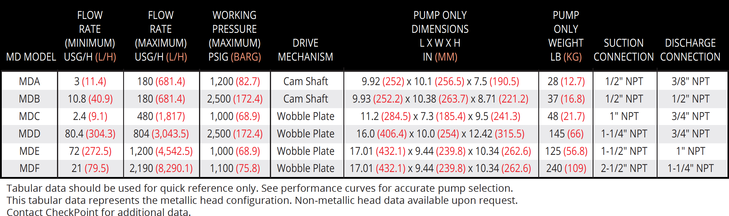 CheckPoint’s Series MD electric diaphragm pump delivers up to 2,220 USG/H (8,403 L/H) and can reliably inject into pressures up to 2,500 PSIG (172 BARG) per head.